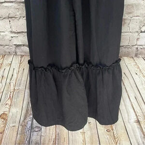 Women's VICI Give A Little Jumpsuit Size Medium. Black with adjustable bust, elastic waist, ruffle trimming at the legs and center front cut out with tie shoulders. Made of Rayon & Wire. Gently Used, Please see picture's.