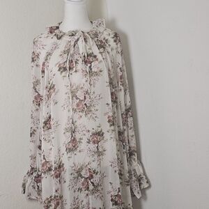 This stunning VICI x FATE exclusive floral maxi dress is a must-have for lovers of feminine, romantic style. Featuring a soft cream background with vintage-inspired rose print, this flowy dress has a relaxed, tiered silhouette with long sleeves and ruffle cuffs. The neckline ties with a delicate bow and has subtle ruffle trim, enhancing the cottagecore charm. Made with a lightweight, semi-sheer crinkled fabric, it’s perfect for spring, summer, or layering in cooler seasons.