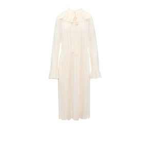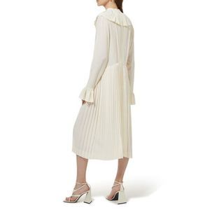 Elegantly tailored with smooth silk fabric, this romantic tea dress features a tie neckline with a vintage-inspired ruffle overlay, a pin-tucked bodice, bell cuffs, and a pleated midi skirt.