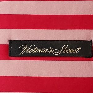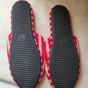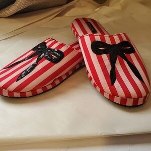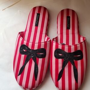 VICTORIA SECRET LARGE NWOT. PINK RED STRIPES BLACK BOW SLIPPERS. SATIN