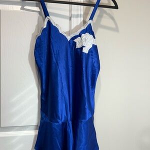 Elegant blue satin sleepwear featuring delicate white lace trim. Perfect for a comfortable and stylish night's sleep.