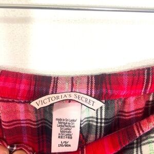 Victoria Secret pajama bottoms, size Large, beautiful plaid red/ Pink/ black/ metallic, black lace trim on leg bottoms, in good condition