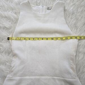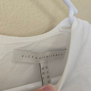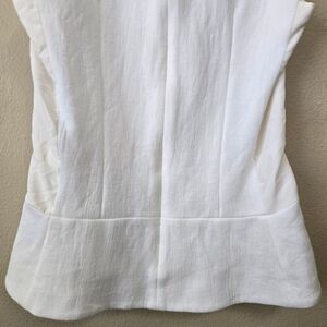 The Victoria Beckham V-Neck Peplum High Low Sleeveless Cotton Silk Top Blouse in US size 6 is a stylish and versatile piece for any woman's wardrobe. Made from a luxurious blend of polyester, silk, and cotton, this blouse features a flattering V-neckline and a unique peplum hem. The solid ivory white color with the fitted silhouette adds a classic touch. It features high-quality construction and silk side panels. This blouse from the renowned Victoria Beckham brand is sure to become a go-to piece for any occasion.