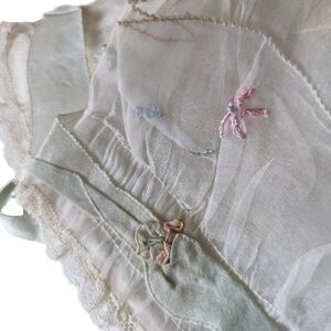 From the 1920s or earlier, this gorgeous white & pale blue silk bonnet has a blue ribbon & embroidered flowers. From my mother-in-law's grandmother.