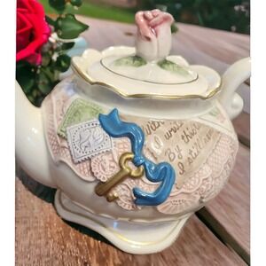 This romantic victorian style teapot is from Fitz and Floyd Omnibus. Beautifully styled with the look of ribbon, roses, a time piece, leaves, a key, and a postcard. Made in 1994 in Indonesia, this teapot is handpainted and handcrafted. With lid on this measures 5.75. From handle to spout, it measures 9.75". This teapot is in very good vintage condition. It holds 25oz.