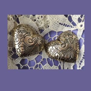 BEAUTIFUL PAIR OF GLOSSY SILVER HEART EARRINGS WITH A FLORAL SWIRLY VICTORIAN DESIGN, THESE ARE FROM THE 1950’S AND ARE ALL METAL WITH A CLIP BACK. BRIGHT AND CRISP WITH NO WEAR TO THE PLATING, THE EARRINGS MEASURE 1.25” X 1.25” . THESE WILL BE SHIPPED TO YOU IN A GIFT BOX WITH TISSUE AND RIBBON, READY TO OPEN AND LOVE OR TO GIFT…PERFECT CLASSIC DESIGN.