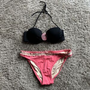 VICTORIA'S SECRET 34C/36B Swim Suit BIKINI TOP JEWEL & Black BOTTOMS Sz M V24
