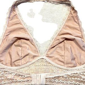 Beautiful blush lace bralette featuring halter style, hook & eye closure and sheer lined cups. Made of polyamide and elastane. In excellent condition.
