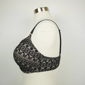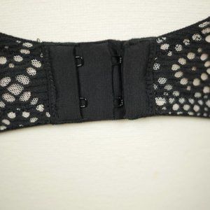 A really pretty and feminine bra. The fabric is stretchy with a black lace over cream. There is a light amount of padding and it has no underwire.