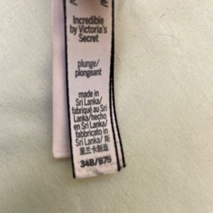 This is a Victoria’s Secret bra, Size 34B, the tag says “Incredible by Victoria’s Secret” and also says “Plunge”. It has padding with lace overlay. Adjustable strap.