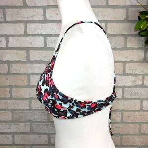 The bikini top has a ring in the center with a criss cross design in back and a colorful animal print throughout. Excellent condition.