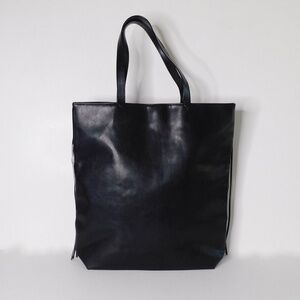 Two/Double handles on the top edge ~ One large open compartment inside ... with one large slip pocket inside ~ Long fringe trims across the front ~ Faux or vegan leather fabric ~ Solid black with an embossed “Victoria’s Secret” across the top in pink lettering