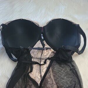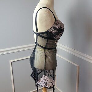 VICTORIA'S SECRET Black Mesh Pink Lace Push Up Bra Intimate Slip Dress Teddy