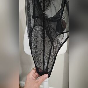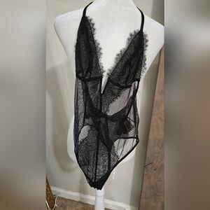 VICTORIA'S SECRET Black V-Wire Lace Plunge Teddy Halter Neck Thong Back.SM NWT