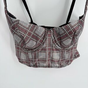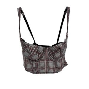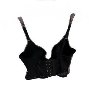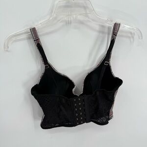 VICTORIA’S SECRET DREAM ANGELS LIGHTLY LINED LONG LINE SATIN BRA PLAID Size 34C. Polyester elastane. Adjustable. Plaid satin front, black lace back. Copper color hardware. Back closure. Very good preowned condition.