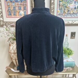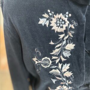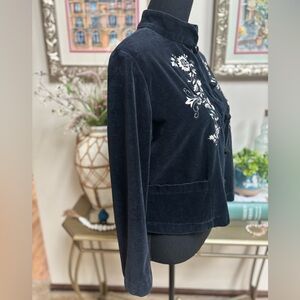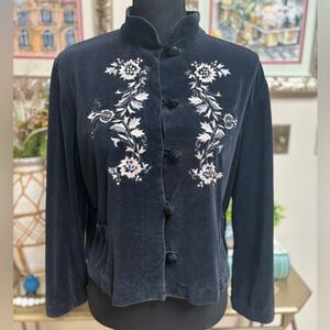 Navy velvet blazer with delicate silver and baby blue floral embroidery. Features elegant button closures and pockets. Ideal for stylish layering, very versatile. Dress up this jacket with a pair of heels or down with a t-shirt and tennis shoes . Measurements 21” ptp, length 21”.