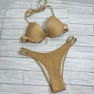 VICTORIA’S SECRET GOLD SHIMMER RUFFLE TRIM HALTER BIKINI TOP & BOTTOM SET 32B/S