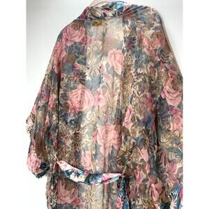 VICTORIA'S SECRET Kimono OS Blue Pink Floral Satin Belt Vintage Gold Label EUC