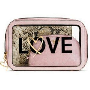 Fits: mists, lotions, makeup brushes, lipsticks and travel essentials 1 exterior bag with 2 interior bags