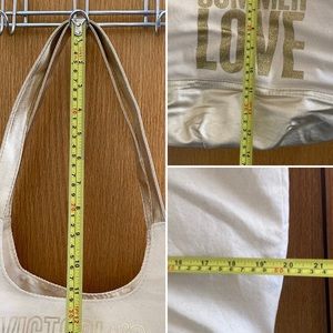 ☀️ “Summer Love” tote bag from Victoria’s Secret. Cream and metallic gold, perfect for the beach or pool! Opens wide with an oval shaped base. Cream canvas with gold handles, lettering and base. The words ‘summer love’ are glittery. Very good used condition, no noted marks or damage but please inspect all photos carefully and feel free to ask questions :)