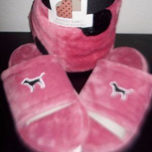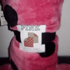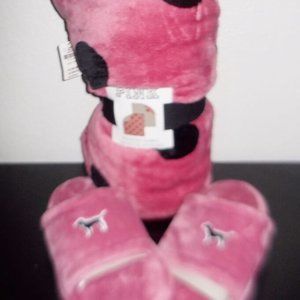 VICTORIA'S SECRET PINK BEGONIA REVERSIBLE POLKA DOT FLEECE BLANKET & SLIPPERS