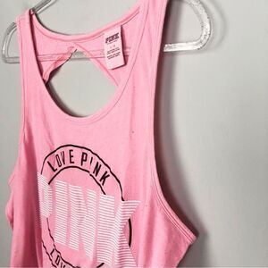 Cute and comfy tank top by VS Pink. Loose fit. Coral pink color. Sleeveless. Love Pink circle graphic on the front. Open back cutout. Has pilling and wash wear (shown in last photo example) but still life left. Womens size large.