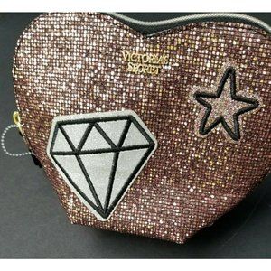 VICTORIAS SECRET PINK GLITTER SEQUIN HEART COSMETIC BAG MAKEUP CASE
