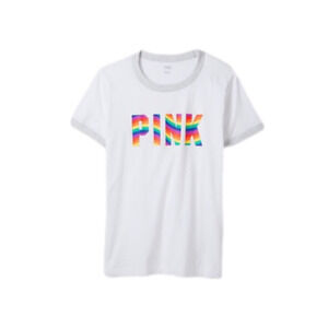 VICTORIA'S SECRET PINK MED COTTON Rainbow CAMPUS RINGER T-SHIRT white NWT