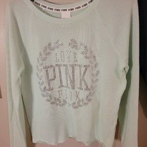 Mint green lightweight pullover sweater with rhinestone PINK LOVE logo.