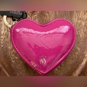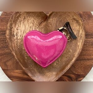 Pink patent leather heart shaped zip around coin case. Has gold tone hardware. Easy latch onto hand bag or backpack.