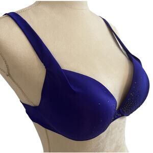 VICTORIAS SECRET Plunge Satin Midnight Blue W/ Rhinestones Padded Bra Size 34C.