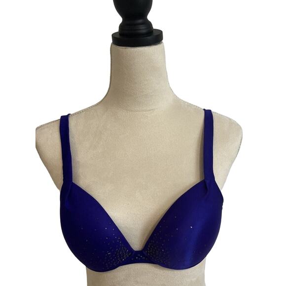 VICTORIAS SECRET Plunge Satin Midnight Blue W/ Rhinestones Padded Bra Size 34C.