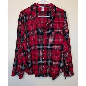 This Victoria's Secret red metallic plaid shimmer flannel pajamas set in size Large features a classic and festive design perfect for the winter and fall seasons. Made from a blend of viscose and cotton flannel, the set includes long sleeves, a collared neckline, and button closure for a comfortable sleepwear option. The set also features subtle logo accents, making it a stylish addition to any woman's wardrobe. Machine washable and easy to care for, this pajama set is a must-have for any holiday or classic-themed sleepwear collection.