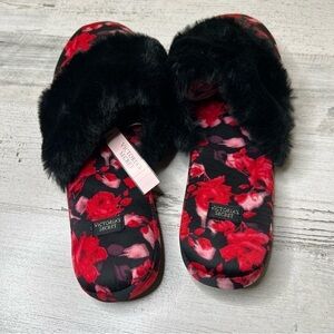 VICTORIA'S SECRET Black Red Pink Floral Furry Satin Silk Indoor Slippers Shoes