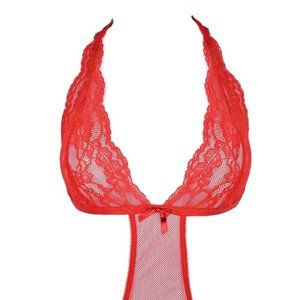 Victoria's Secret lace one piece in a classic red color. Hook closure. Monokini style. Sheer lace mesh. Ribbon bow details. Sexy lingerie. Halter neck. Cheeky bottom. No stains or holes.
