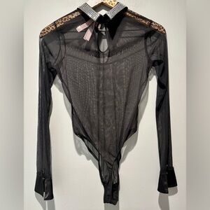 VICTORIA’S SECRET | Rhinestone Collar Sheer Black Thong Satin Cuff Bodysuit NWT