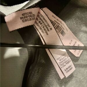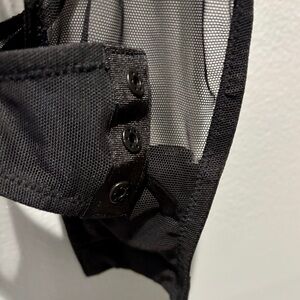 Very Sexy black sheer bodysuit with satin button cuffs and rhinestone/embellished collar, three snap thong closure. NWT