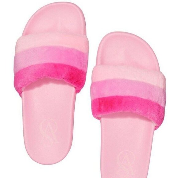 VICTORIAS SECRET STRIPED FAUX FUR SLIDES SLIPPERS BARBIE COLORS M NWT