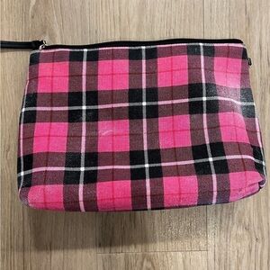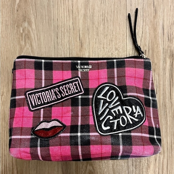 VICTORIA'S SECRET Valentine's Day Pink Black Plaid Cosmetic Make Up Bag Patches