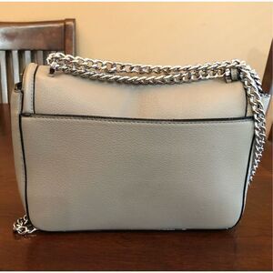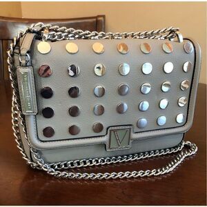 Victoria's Secret "Victoria" Pebbled Faux Leather Medium Convertible Shoulder Bag/Crossbody. She's 9.5" x 7" x 3", with a bold stainless steel chain strap with a drop of 23" (or 13" when doubled). Beautiful medium/size shoulder bag in gray with silver-tone stud embellishments and a "jewelry like" silver-tone chain strap. This bag is adorable with a cute, tailored and structured silhouette and a 3/4-size flap closure, featuring a silver "V" logo plaque. The back of bag has a 4/5-size slip pocket, handy for keys and phone. Interior has a pristine black-on-black striped polyester lining with VS logo tag and card slot. Cute Victoria's Secret rectangular bag charm hangs from the chain. This classy bag has no callouts. It really doesn't appear to have been used. VERY NICE!