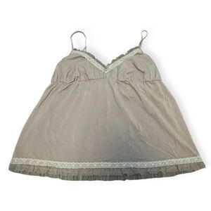 Victoria’s Secret women’s gray knit soft sleep camisole with delicate lace trim and ruffle accents. Features adjustable spaghetti straps and a flattering empire waist cut for a cozy yet feminine fit. Perfect for sleepwear, lounging, or layering for a Y2K-inspired look.