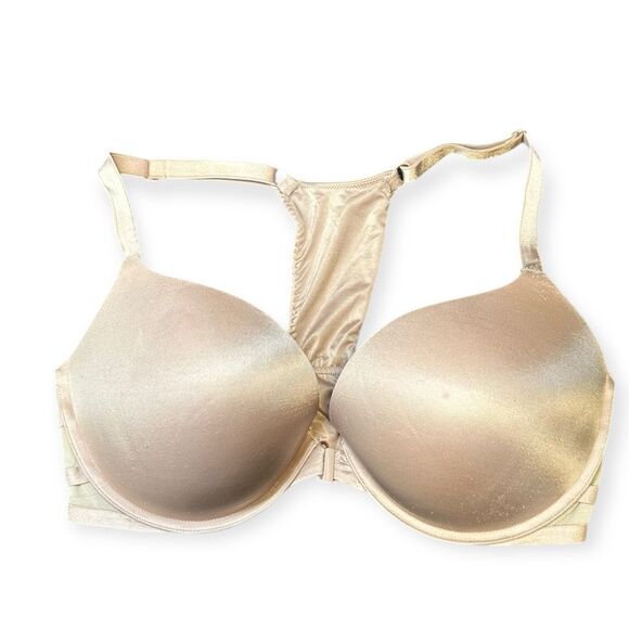 Victoria’s Secret “Very Sexy” front-close push-up bra in a nude beige with satin finish and sheer strappy racerback design. Size 36DD.