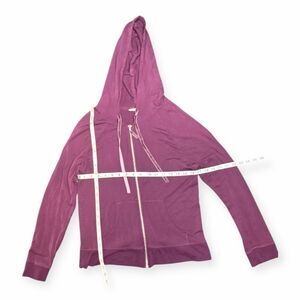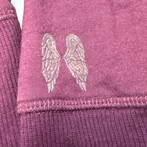 This soft and lightweight Victoria’s Secret hoodie features a gorgeous pink/mauve color, full zip front, drawstring hood, and subtle angel-wing detail on the sleeve. Perfect for layering, lounging, errands, or everyday wear.
