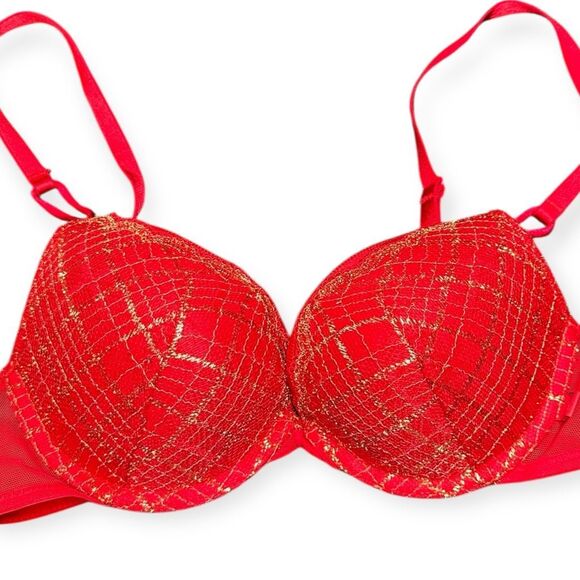 This stunning VICTORIA’S SECRET red push-up bra features shimmering gold metallic thread in a chic geometric pattern. Lightly padded with underwire support and adjustable straps for a perfect fit.