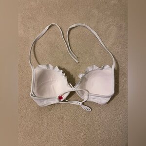 Like new-never worn and no defects. Size 34DD white swim top with a cute ruffle on top, shimmery iridescent sequin bling and ties at top and back. Cute bow tie on front. Padded push-up. Tote 12.