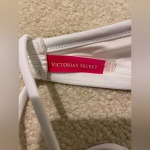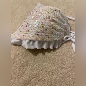 Like new-never worn and no defects. Size 34DD white swim top with a cute ruffle on top, shimmery iridescent sequin bling and ties at top and back. Cute bow tie on front. Padded push-up. Tote 12.