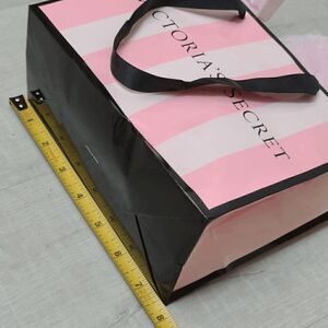Pink striped background with black trim, black " Victoria's Secret " writing on front and back, black fabric double handles