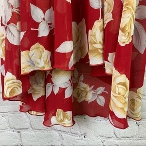 Victoria’s Secret Red Floral Nighty Negligee Size Small. Colors are red, gold, cream, gray. Flower ribbon detail in front. Adjustable straps, shorter in back. In very good condition. All measurements are approximate:
