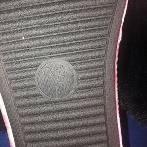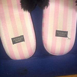 Very glamorous Victoria’s Secret boudoir slippers in sateen material with faux fur across top of arch ridge on bottom for nonslip surface ,size large 9 -11.