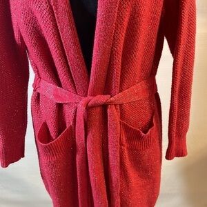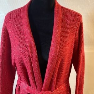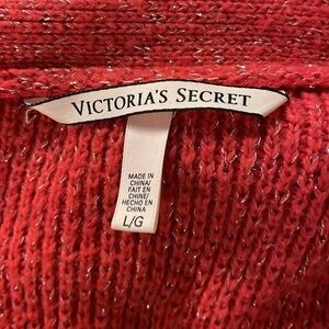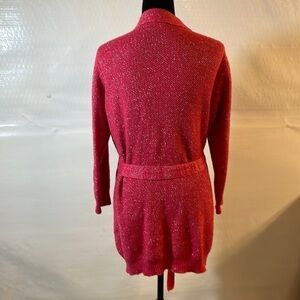 Victoria’s Secret shimmery pink cardigan. Pink with threads of silver. Ties at the waist. Very pretty sweater.